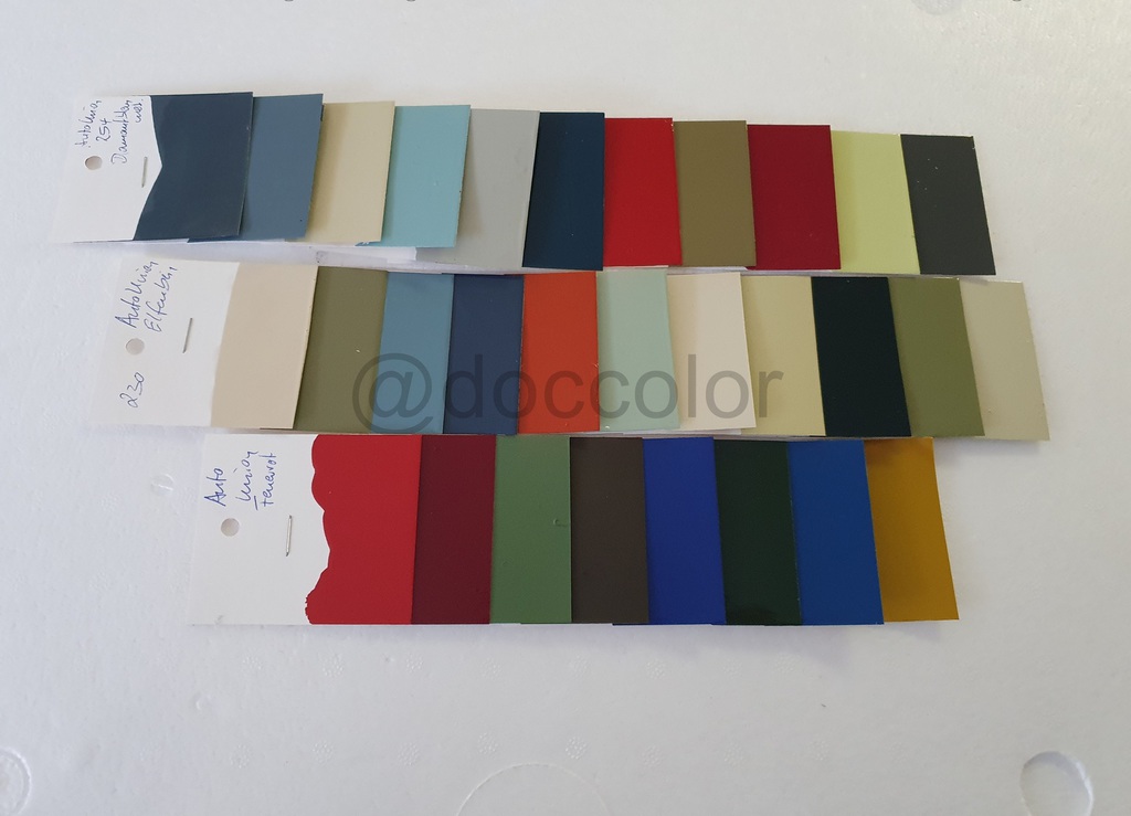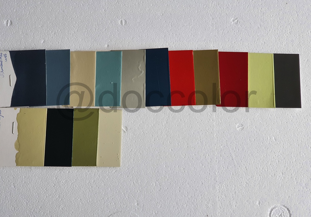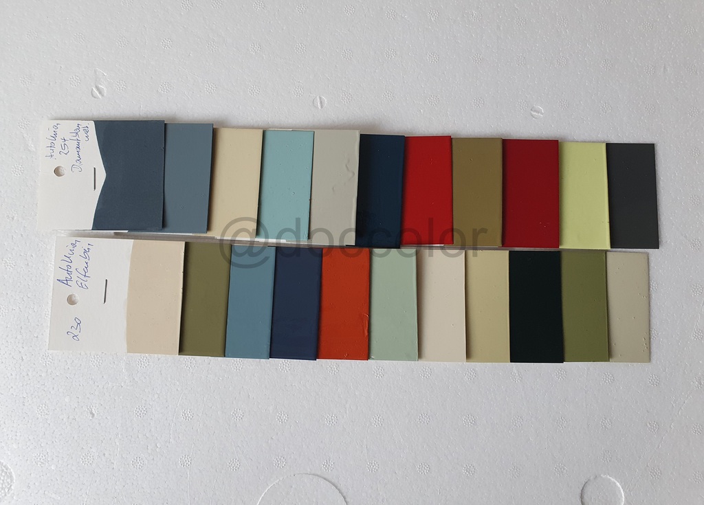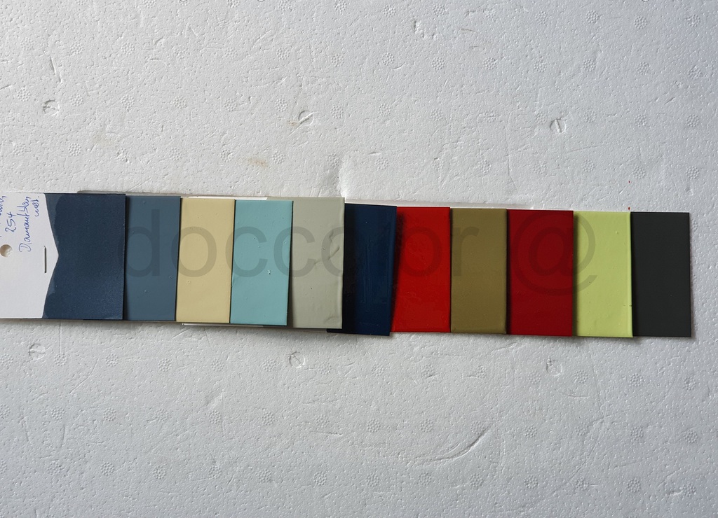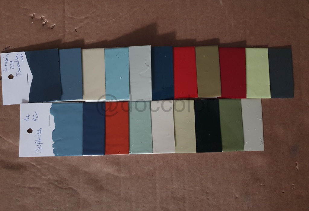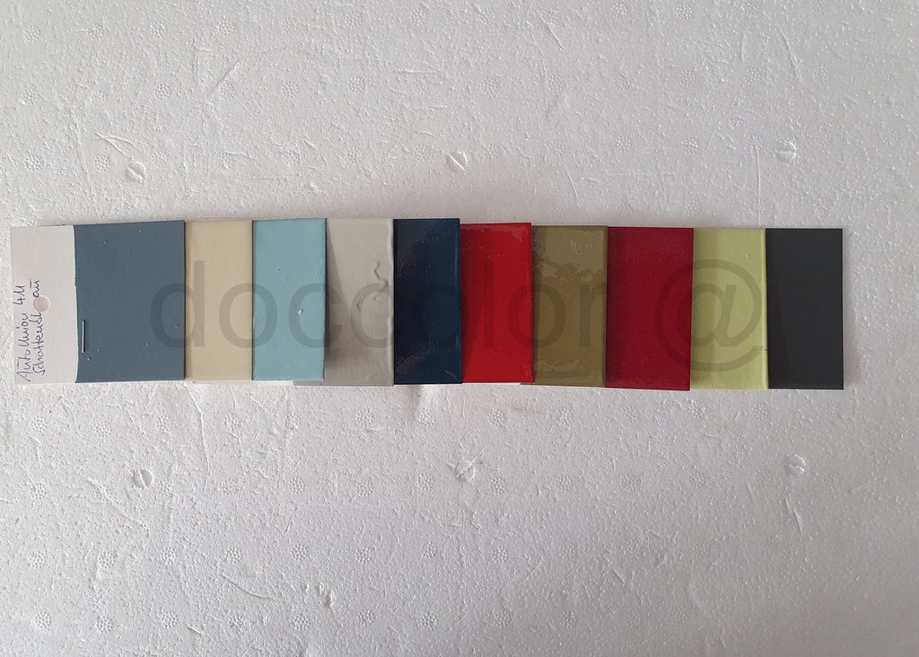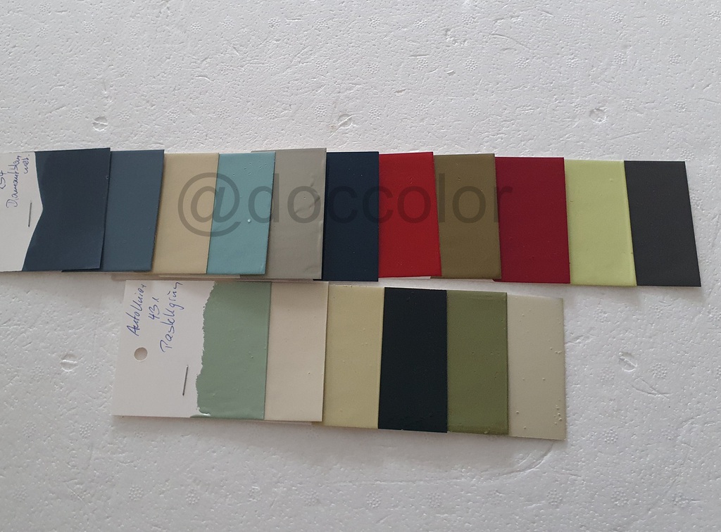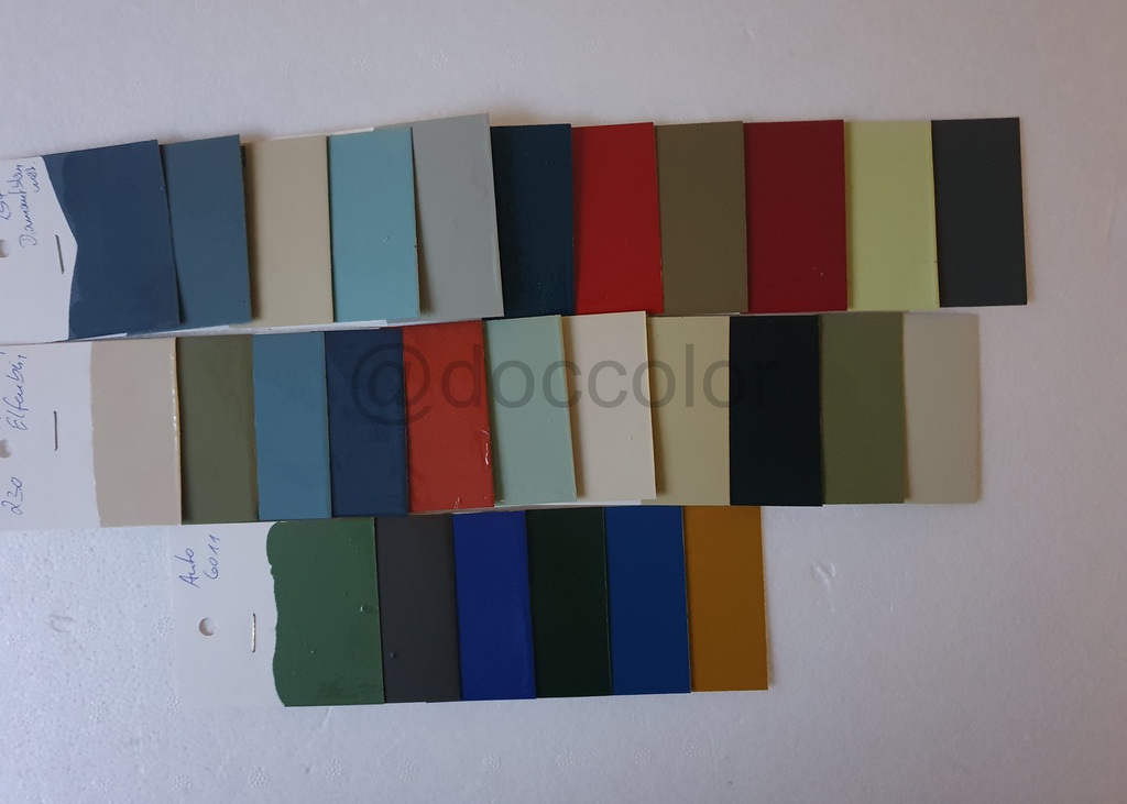 Diamantblaumet.254, Schattenblau411, Elfenbein414, Zenitblau441, Firngrau434, capriblau435, cherryrot426, oliv412, kirschrot450, neapelgelb429, graphitgrau379,