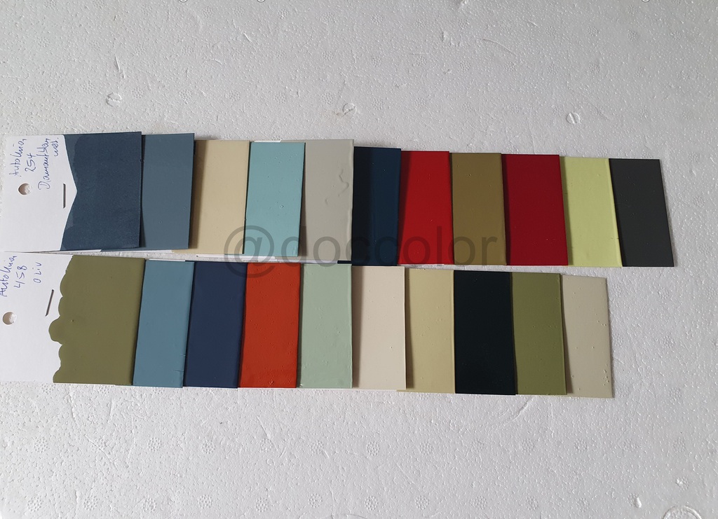 capriblau435, granatrot436, antikweiss423, dunkelbraun453, polarblau454, atlantikblau455, purpurblau456, schiefergrau457, oliv458, brillantgrün459, dunkeloliv464, braunbeige465,