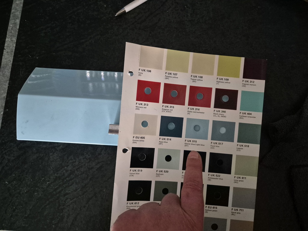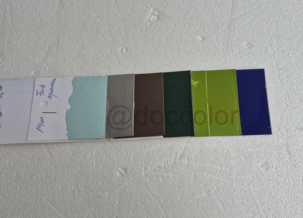 aquamarine(1960), perlgrau hell, gold 66, grün 58, javagrün 1379, signalgrün 1055, bright blue Q1,