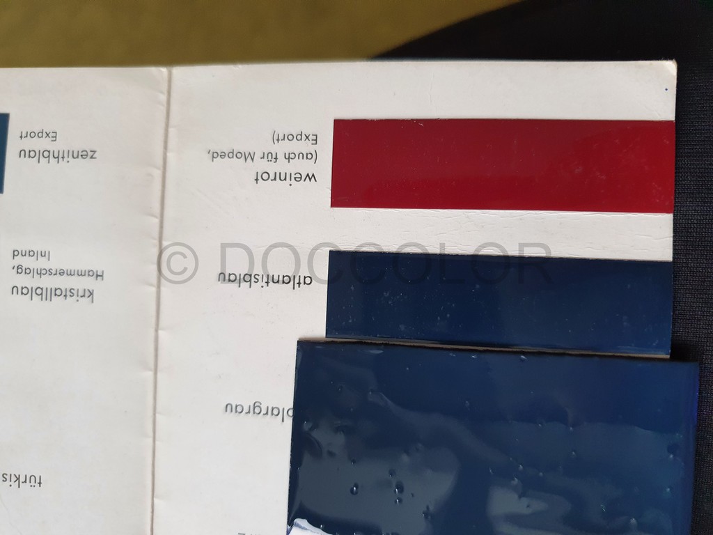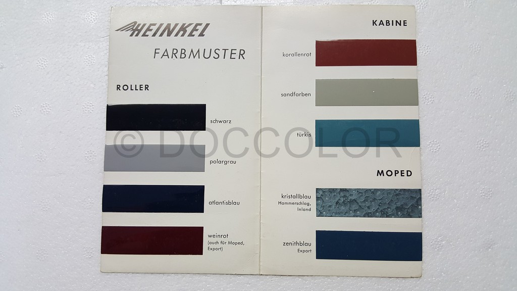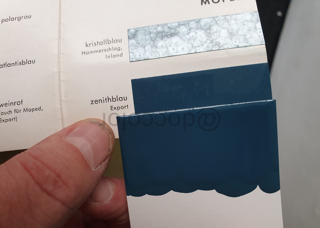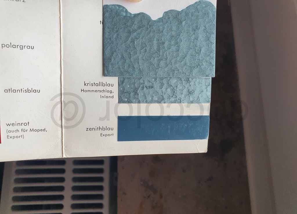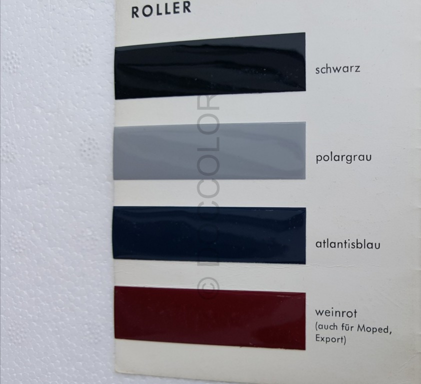 Moped ----- Kristallblau(HS)(57), Altsilber(HS)(57),"Grün"(HS)(56-58), Zenithblau(Export), -----Weinrot(57), Maisgelb(57/58)/li.Gold/Rot, Gold(HS)(55)