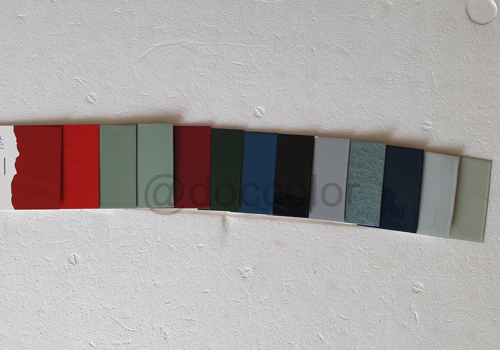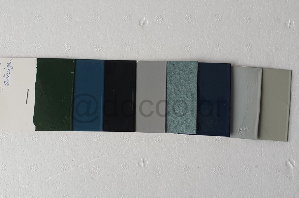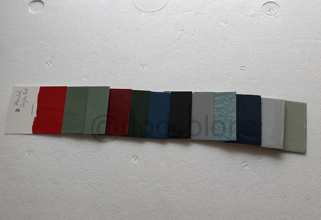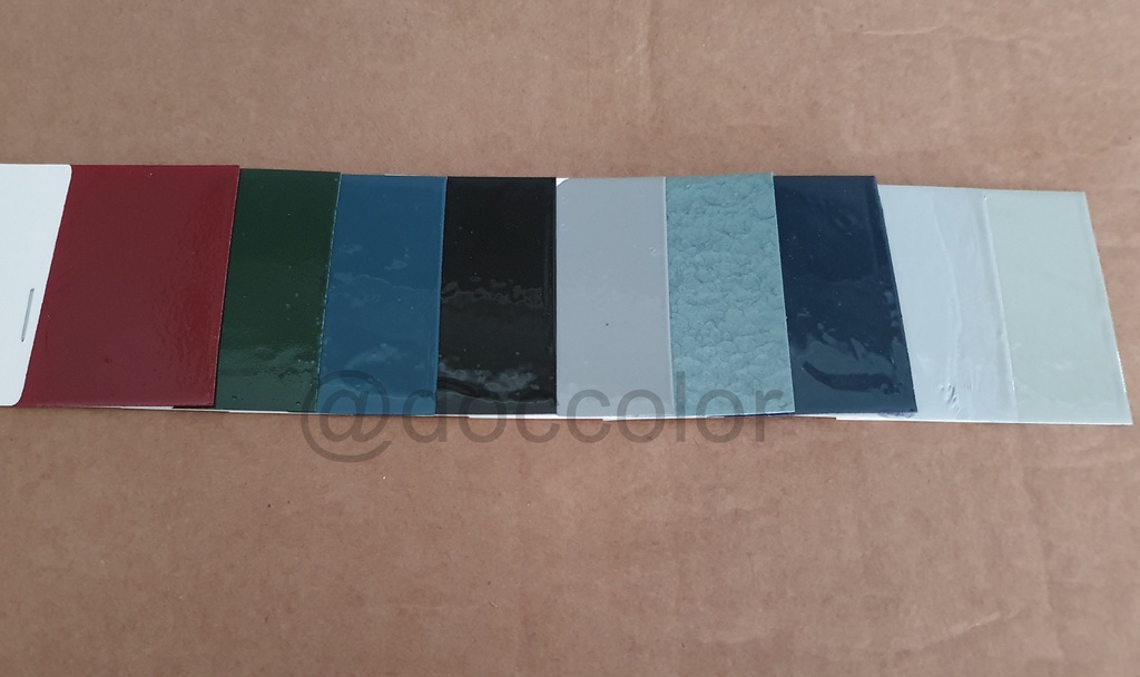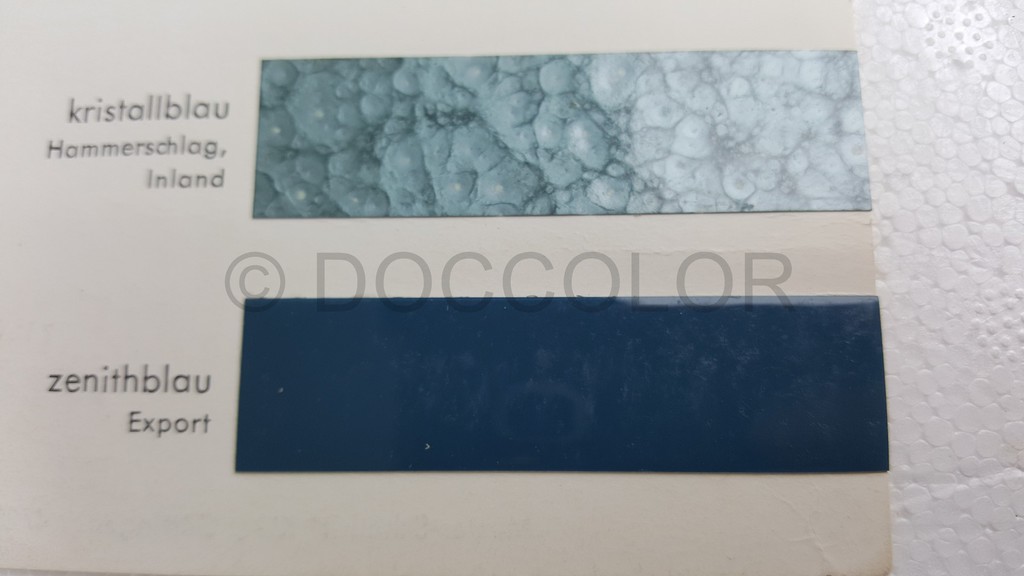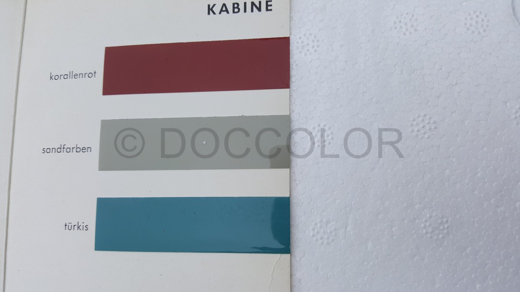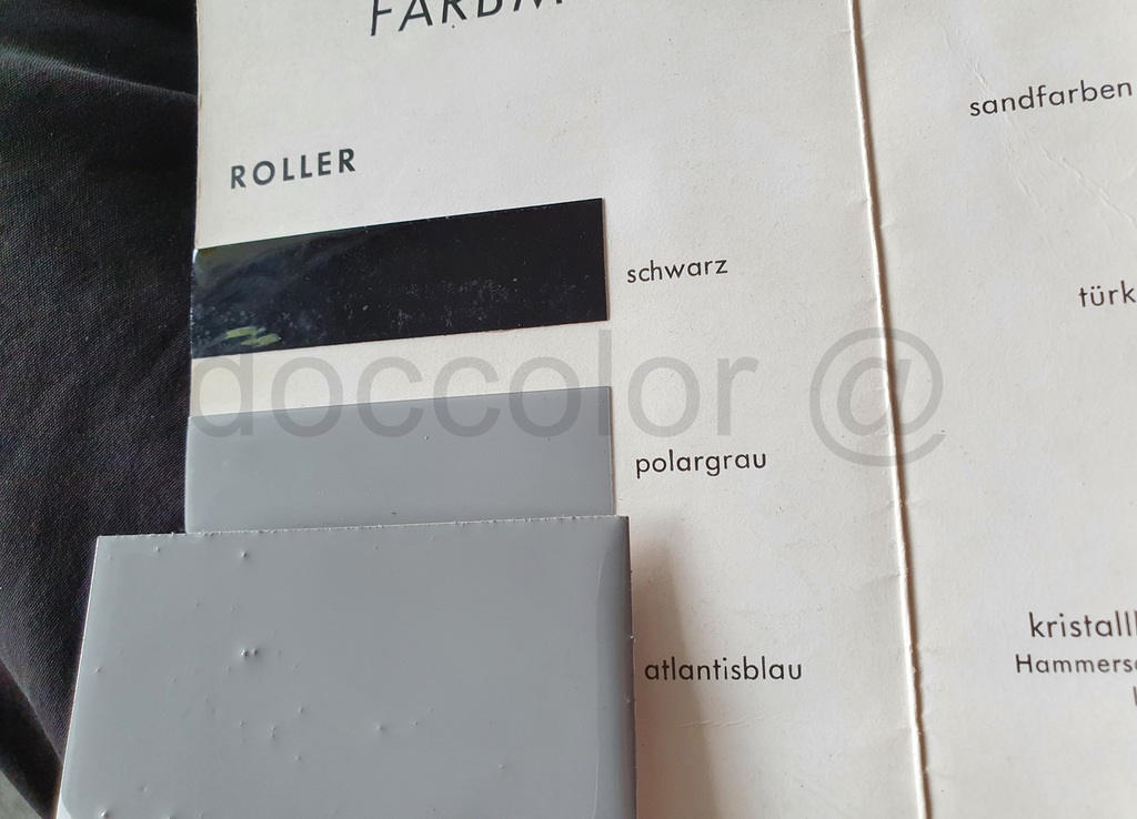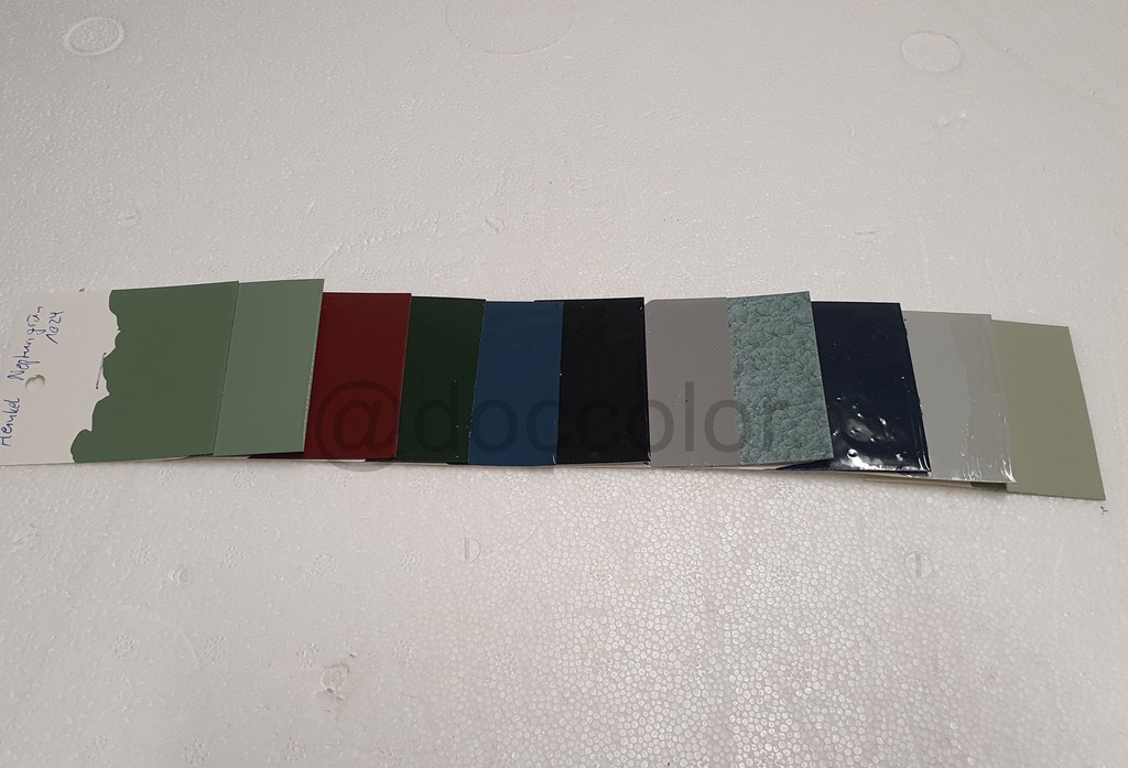 Polizeiweiss, Pelikanrot, TrojanRed, Neptungrün dunkel, Neptungrün, Weinrot, Polizeigrün, Zenithblau, Schwarz, Polargrau, Kristallblau(HS), Atlantisblau, Alabaster(Glasurit), Alabastergrau