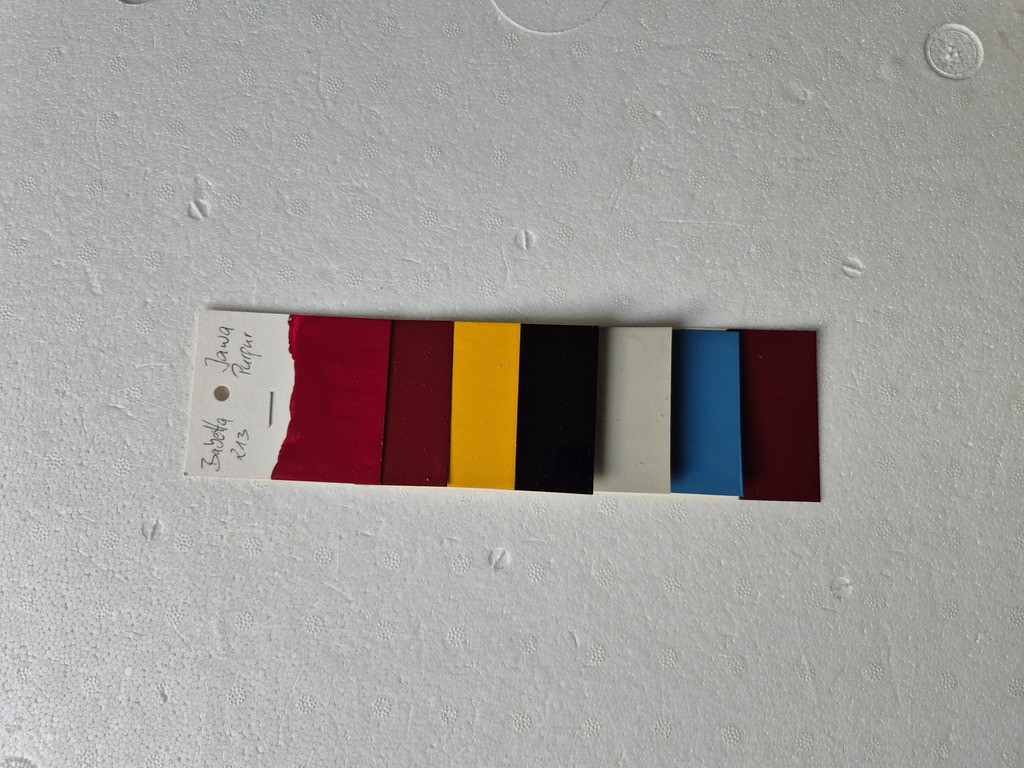 Purpurrot(Babetta), Dunkelrot(354), Gelb(207), Schwarz, Hellgrau, Hellblau, Weinrot(555)
