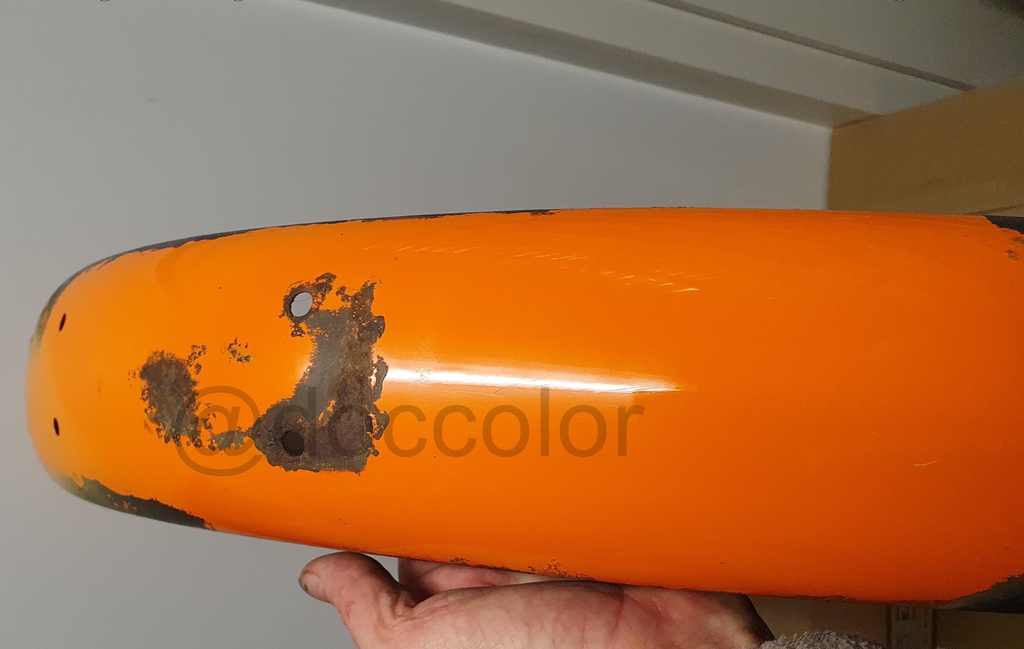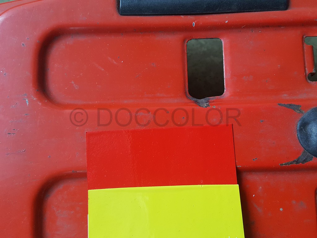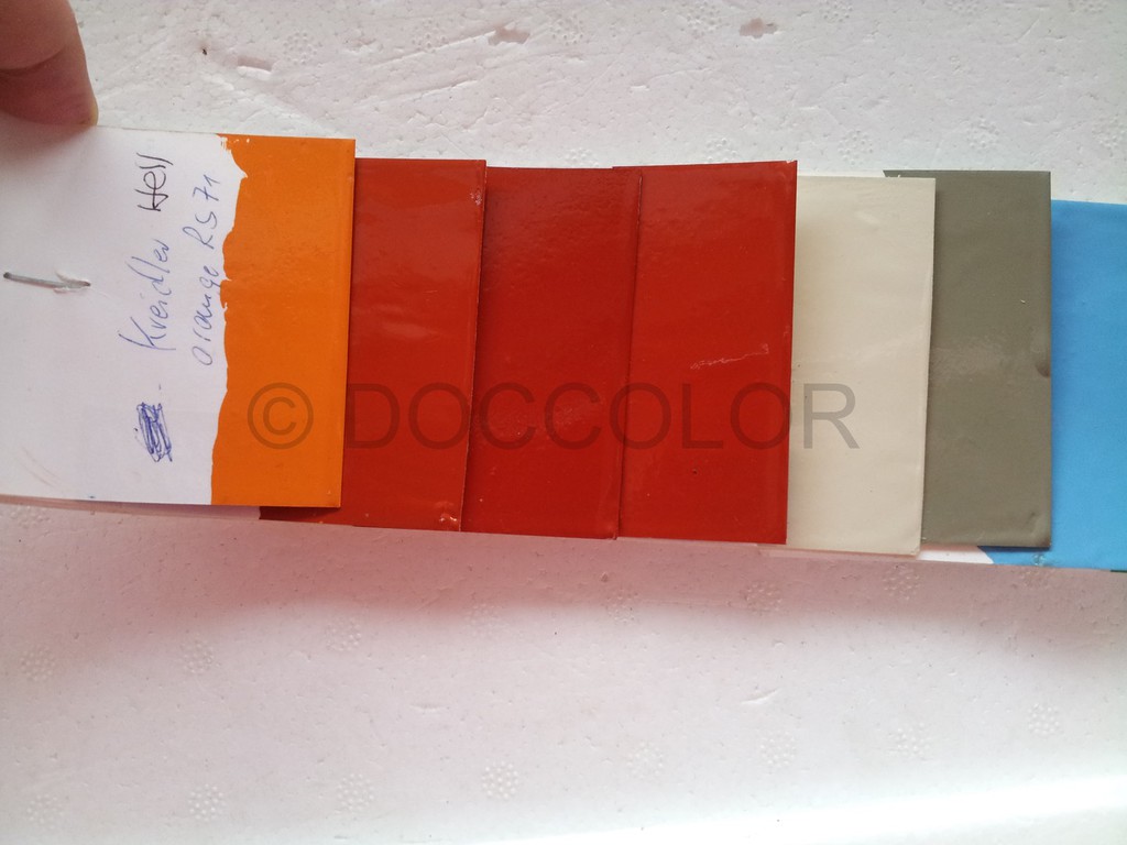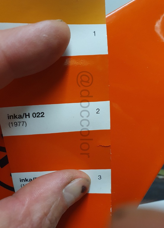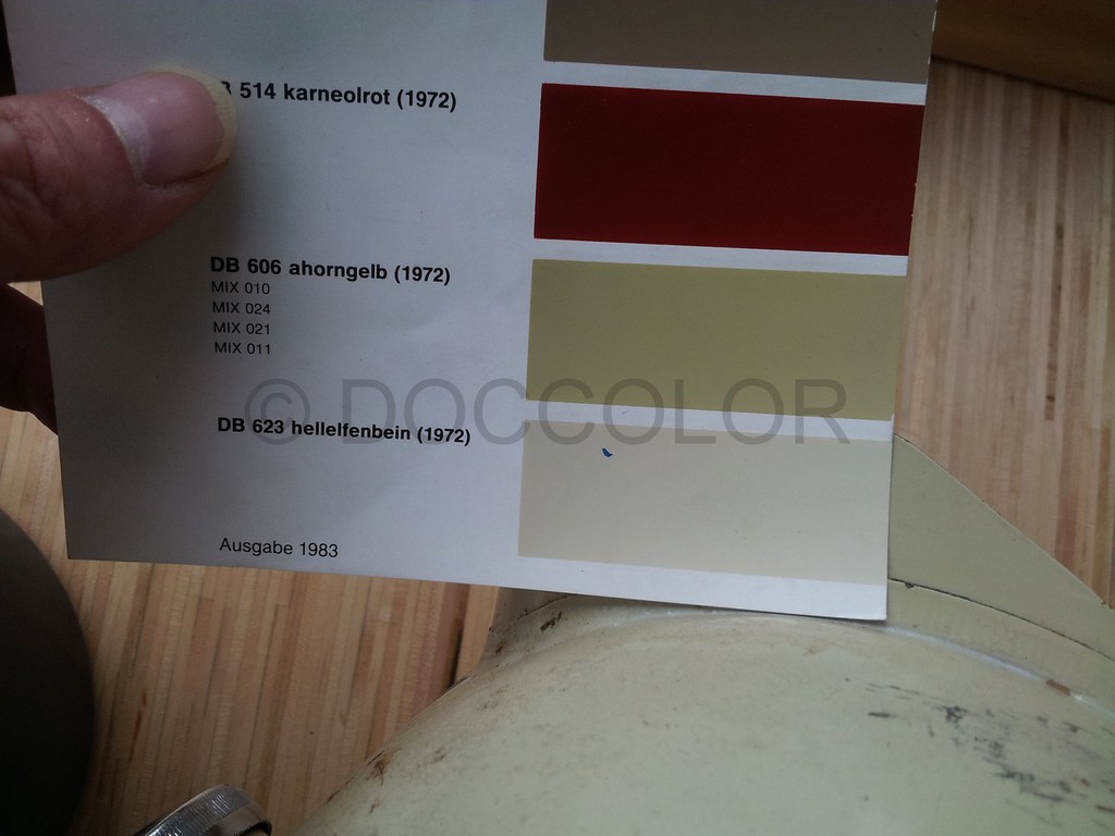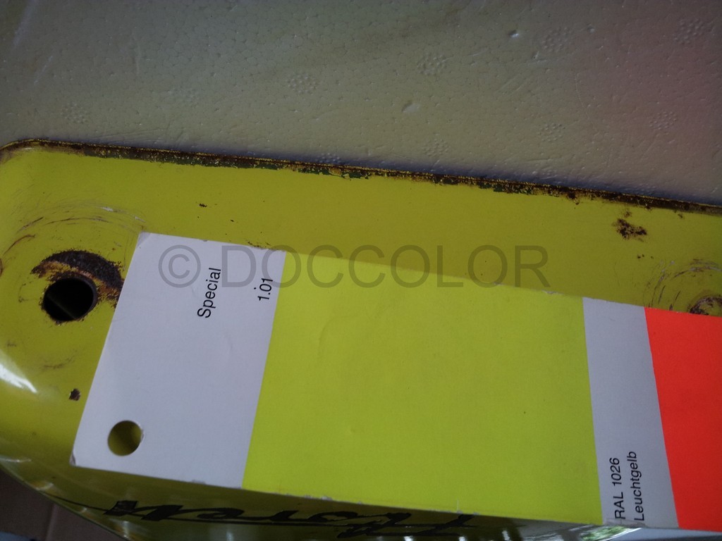 Nachdem ich jetzt endlich ein Originalteil mit sehr vielen unterschiedlich verschossenen Stellen vor Ort hatte, konnte ich einen abgetönten weissen Vorlack und ein passendes Gelb nachmischen. Mit Zugabe vom Gelb kann man das Neonleuchtorange abtönen, dass es bei Ausbesserungen zum jeweiligen verwitterten Ton passt.