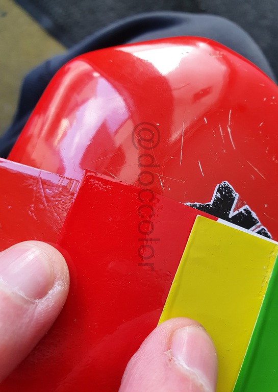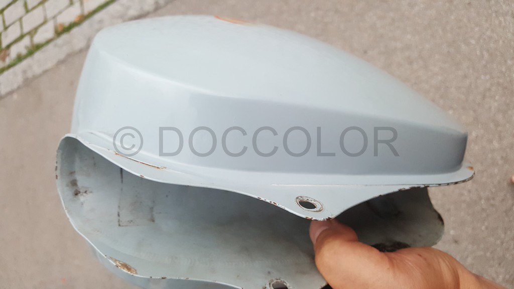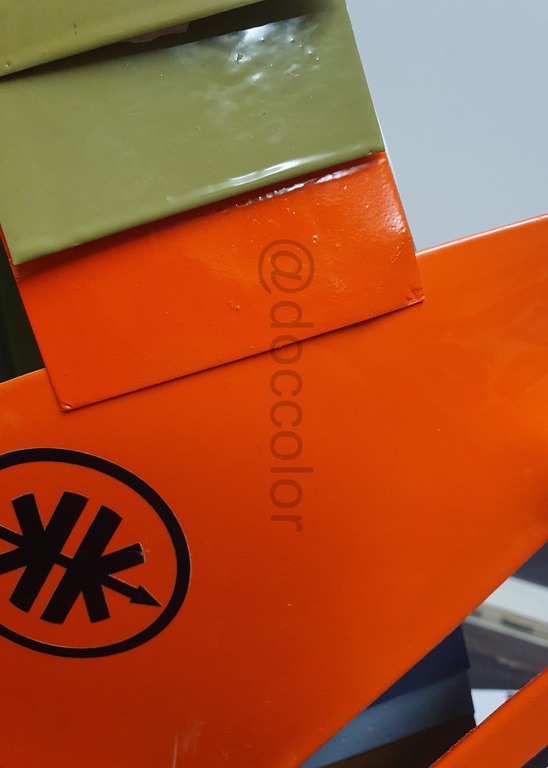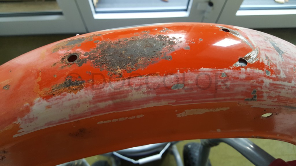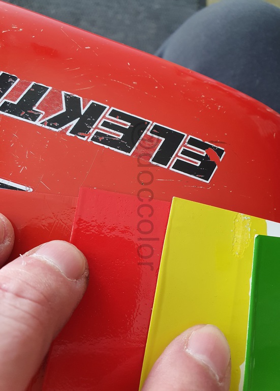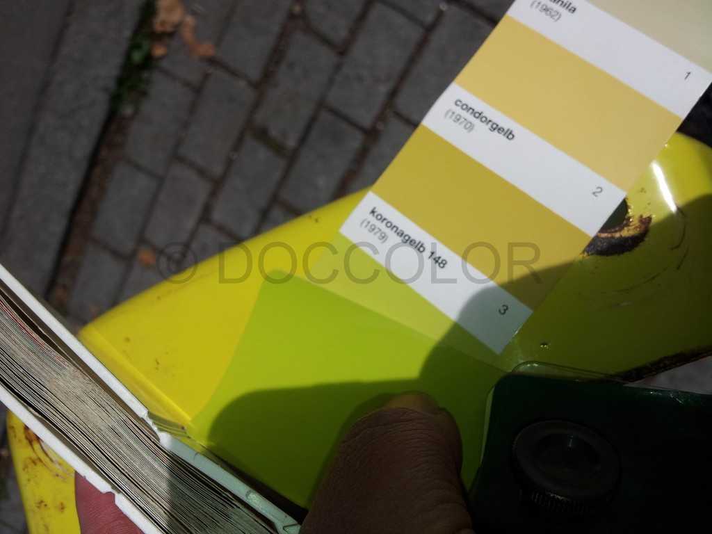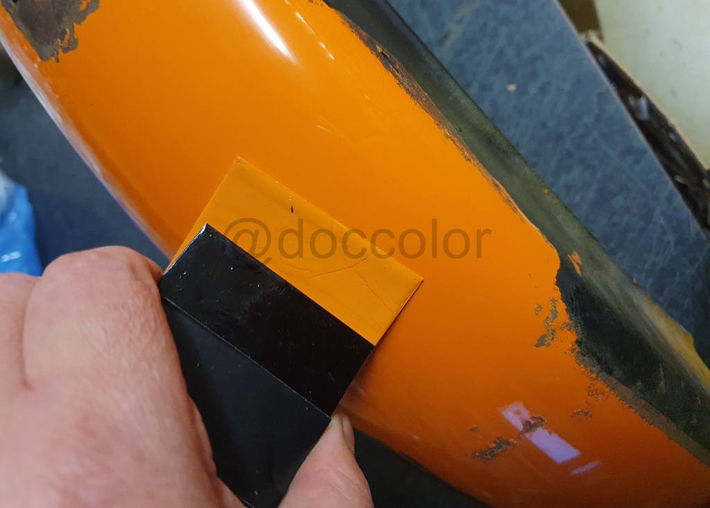 Nachdem ich jetzt endlich ein Originalteil mit sehr vielen unterschiedlich verschossenen Stellen vor Ort hatte, konnte ich einen abgetönten weissen Vorlack und ein passendes Gelb nachmischen. Mit Zugabe vom Gelb kann man das Neonleuchtorange abtönen, dass es bei Ausbesserungen zum jeweiligen verwitterten Ton passt.