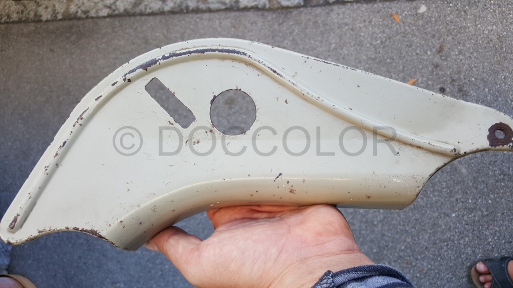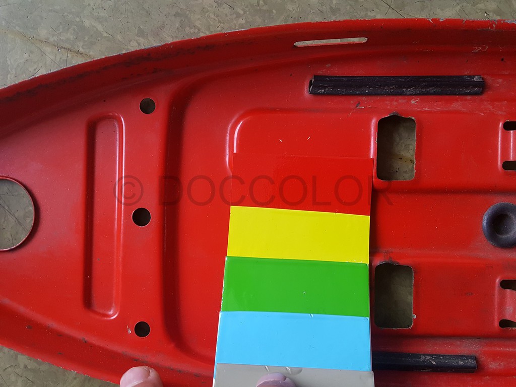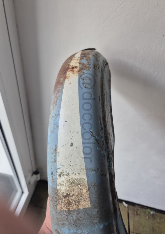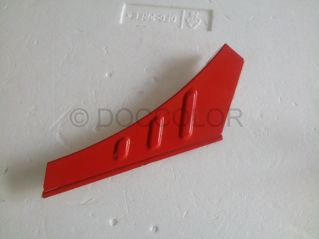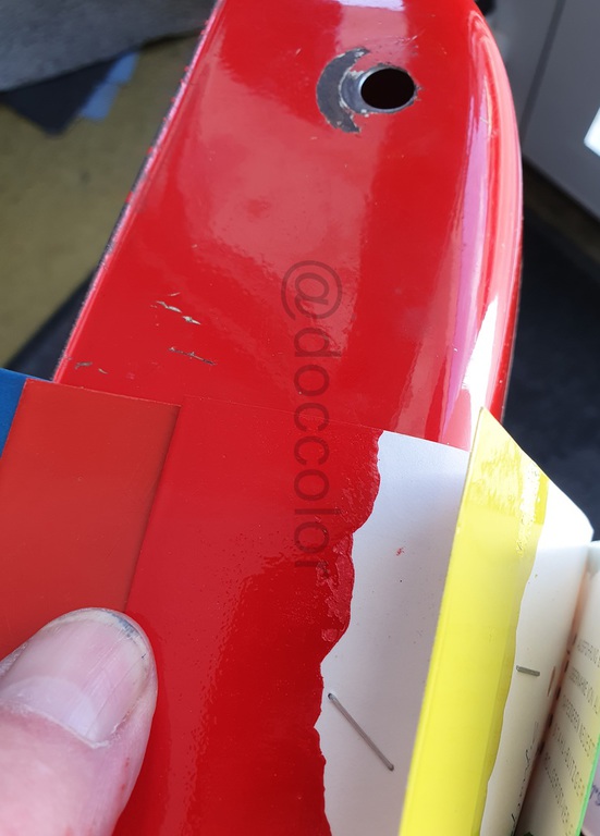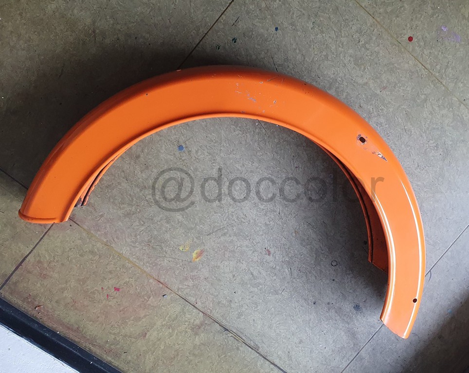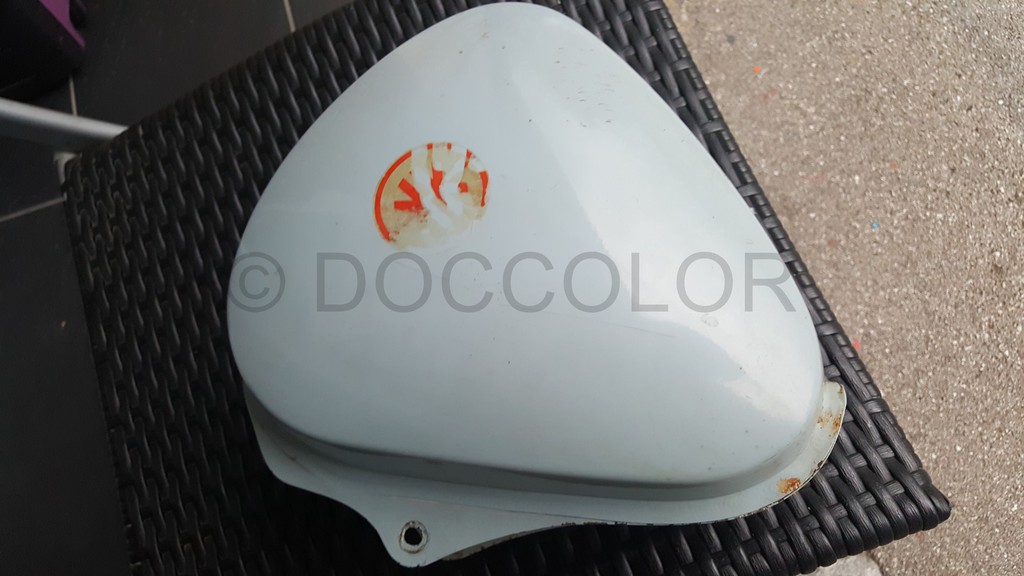 Nachdem ich jetzt endlich ein Originalteil mit sehr vielen unterschiedlich verschossenen Stellen vor Ort hatte, konnte ich einen abgetönten weissen Vorlack und ein passendes Gelb nachmischen. Mit Zugabe vom Gelb kann man das Neonleuchtorange abtönen, dass es bei Ausbesserungen zum jeweiligen verwitterten Ton passt.