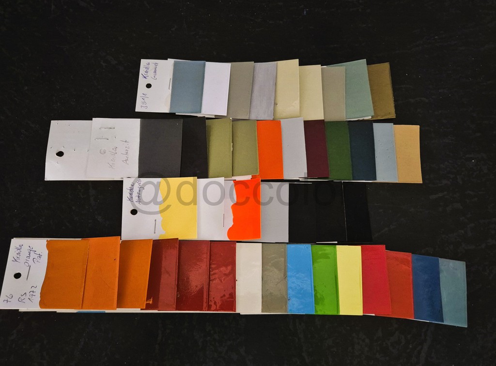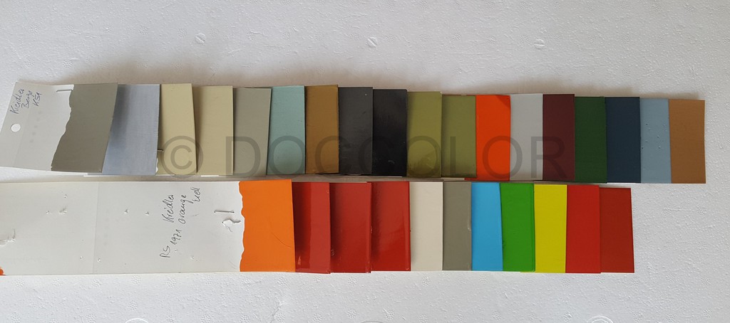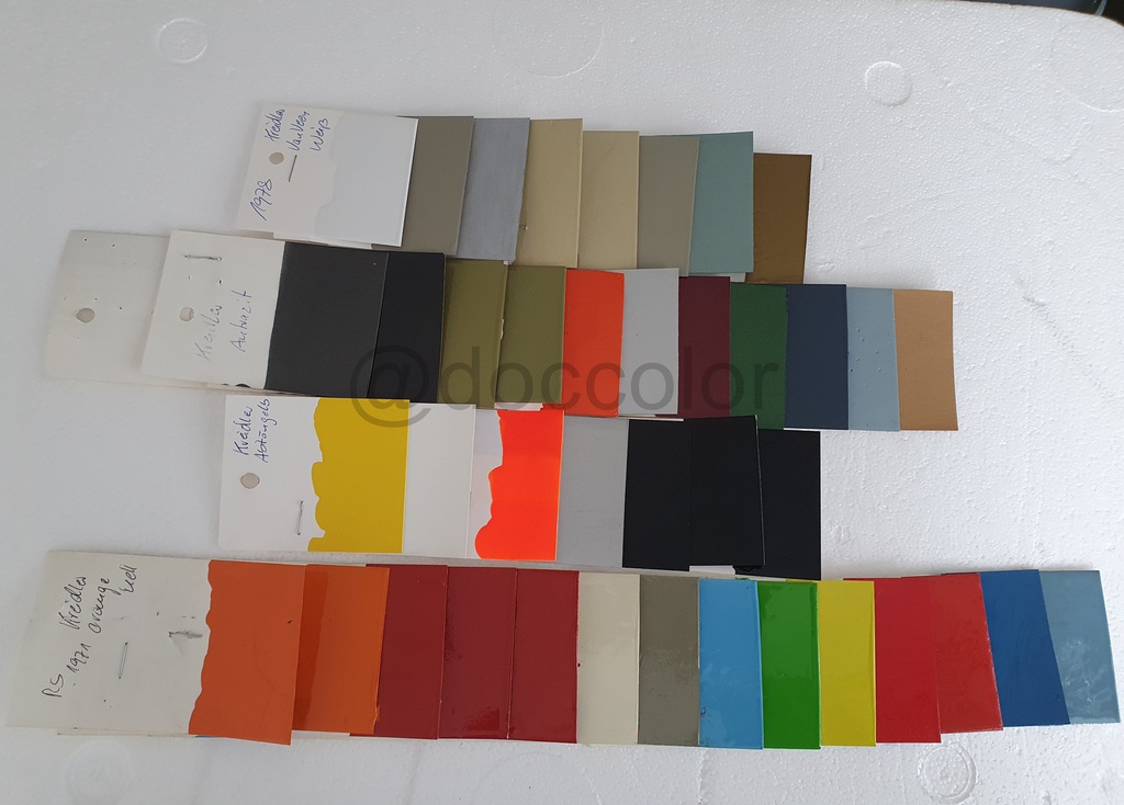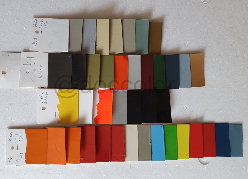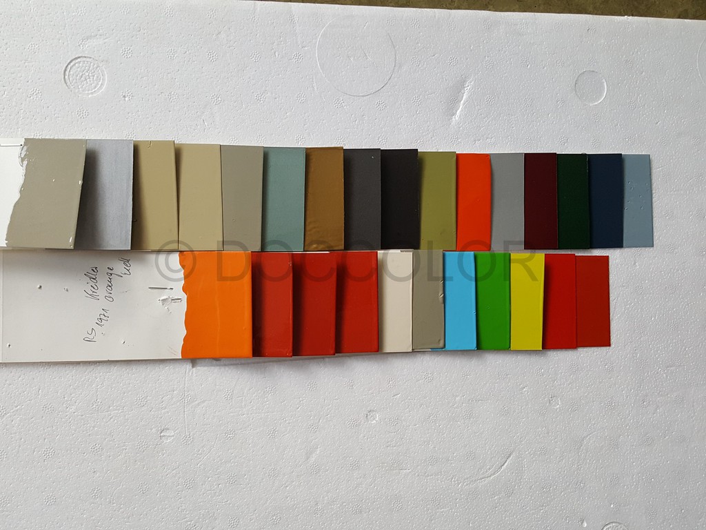 Orange Patina, Orange hell, Orange dunkel, Vulkanrot K53, Vulkanrot Neu, Vulkanrot Alt, Hellelfenbein, Brillantbeige, Capriblau, Golfgrün, Signalgelb, Signalrot, Signalrot Patina, Effektblaumet., Hellblau(Amazone),