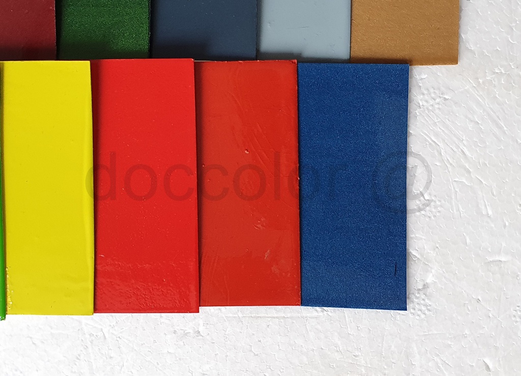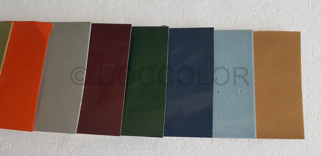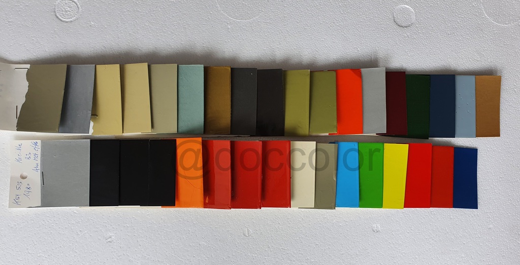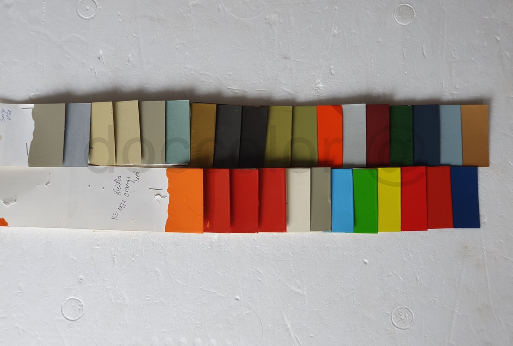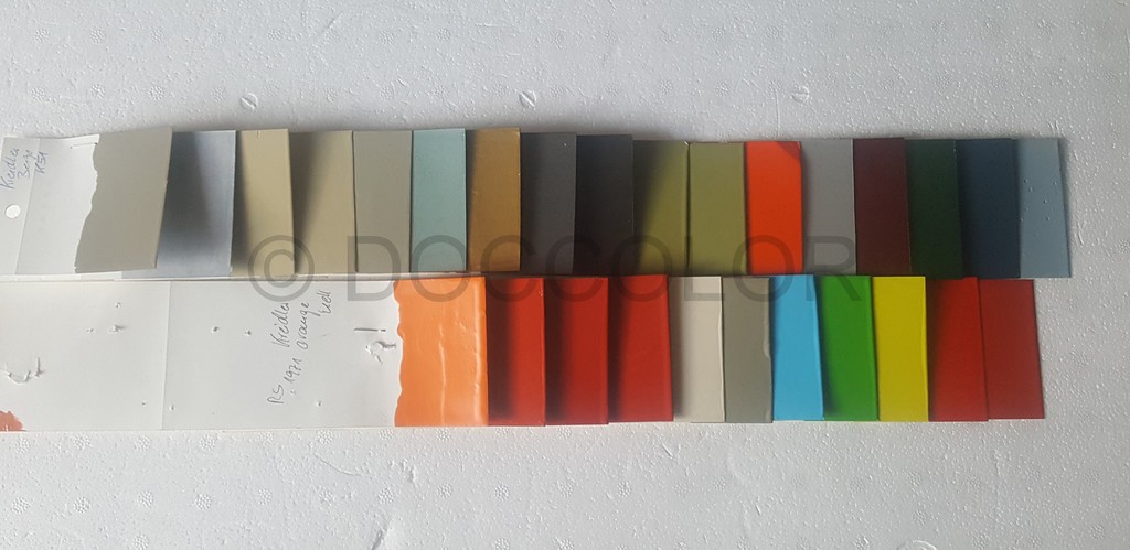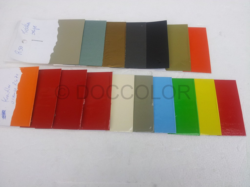 Orange Patina, Orange hell, Orange dunkel, Vulkanrot K53, Vulkanrot Neu, Vulkanrot Alt, Hellelfenbein, Brillantbeige, Capriblau, Golfgrün, Signalgelb, Signalrot, Signalrot Patina, Effektblaumet., Hellblau(Amazone),