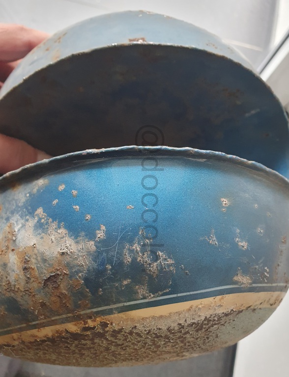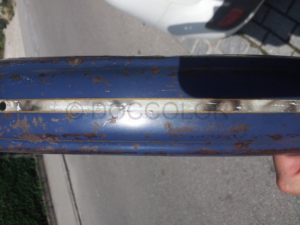 Hier kann man ganz gut sehen, dass alles vorab mit einem rötlichen Schwarzbraun lackiert wurde. Durch Sonneneinstrahlung wurde es dann ein helleres Maron. Den blauen Lack kann man mit dem