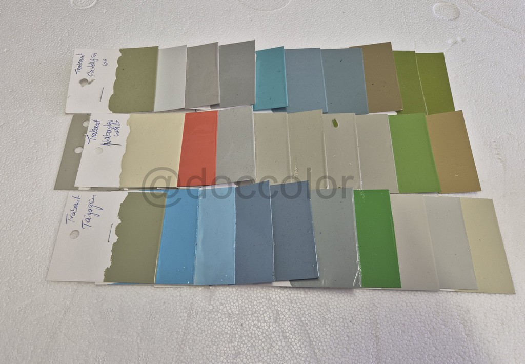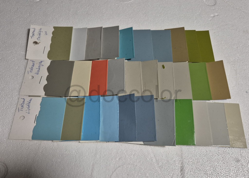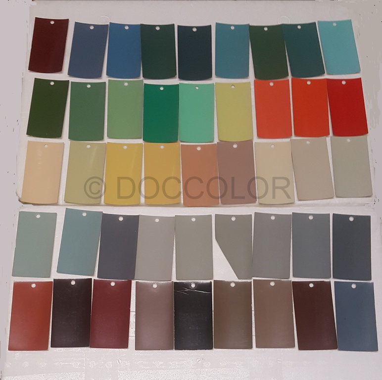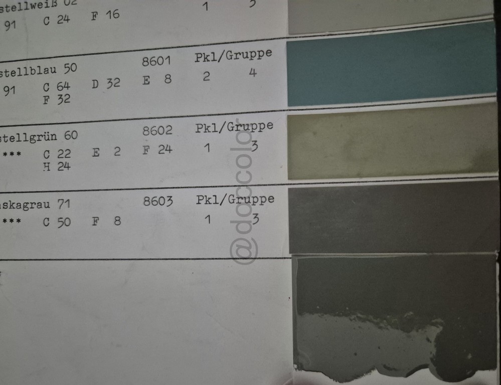 Pastellgrün, Togaweiss, Lenkradgrau, Silbergrau, Aquamarinblau, Pastellblau65, Pastellblau69, Goldolive, Panamagrün grünl., Panamagrün gelber,