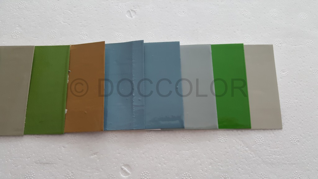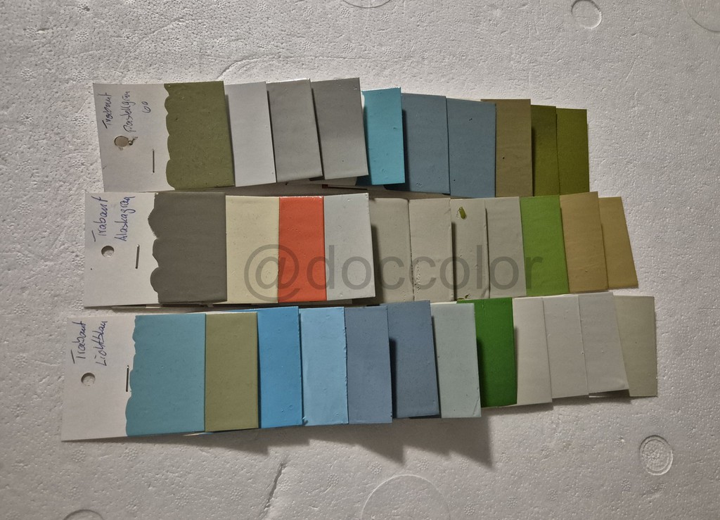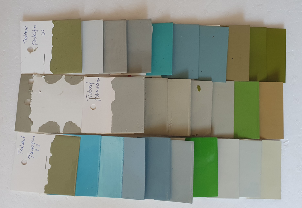 Lichtblau, Taigagrün, Kristallblau dunkel+hell, Gletscherblau alt, Gletscherblau86, Delphingrau89, Cliffgrün, Pastellweiss, Pastellweiss grauer, Pastellweiss, Elfenbein(Schalterleiste),