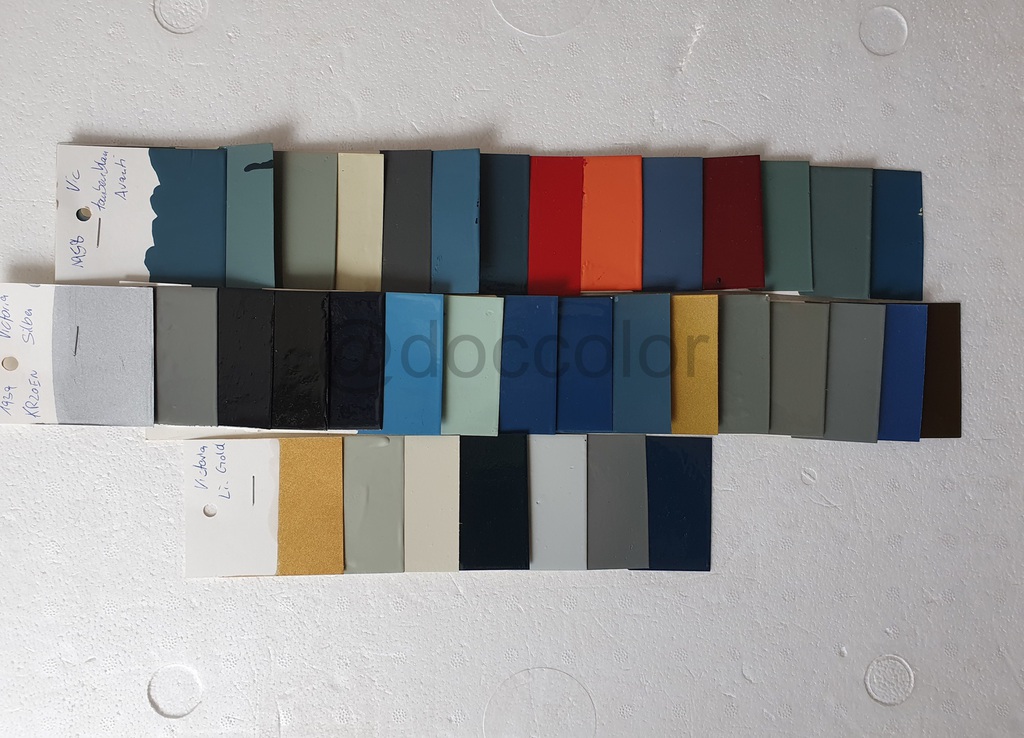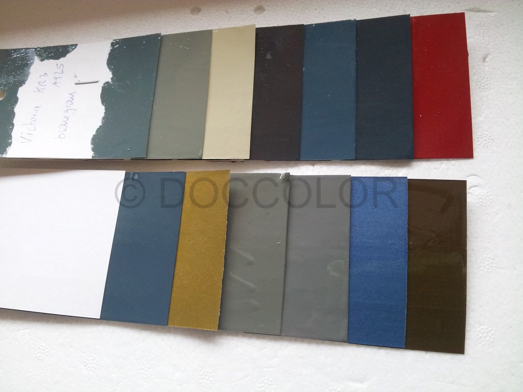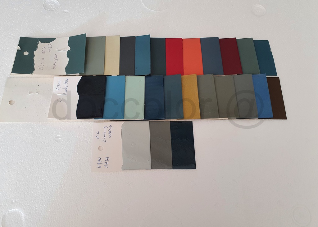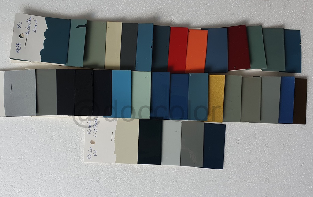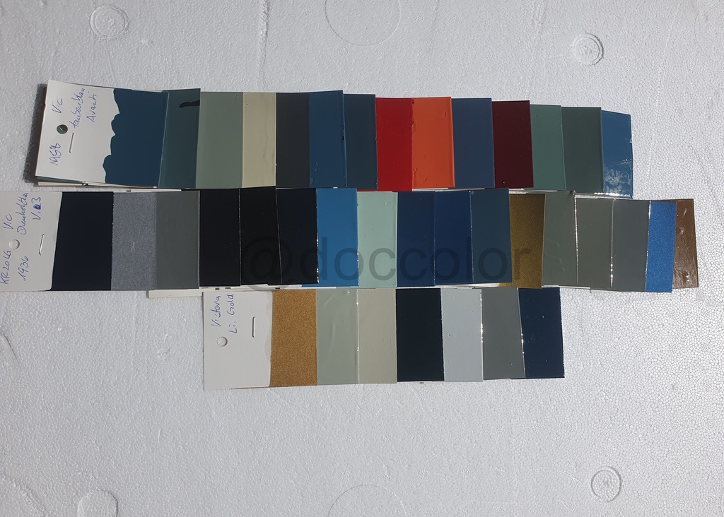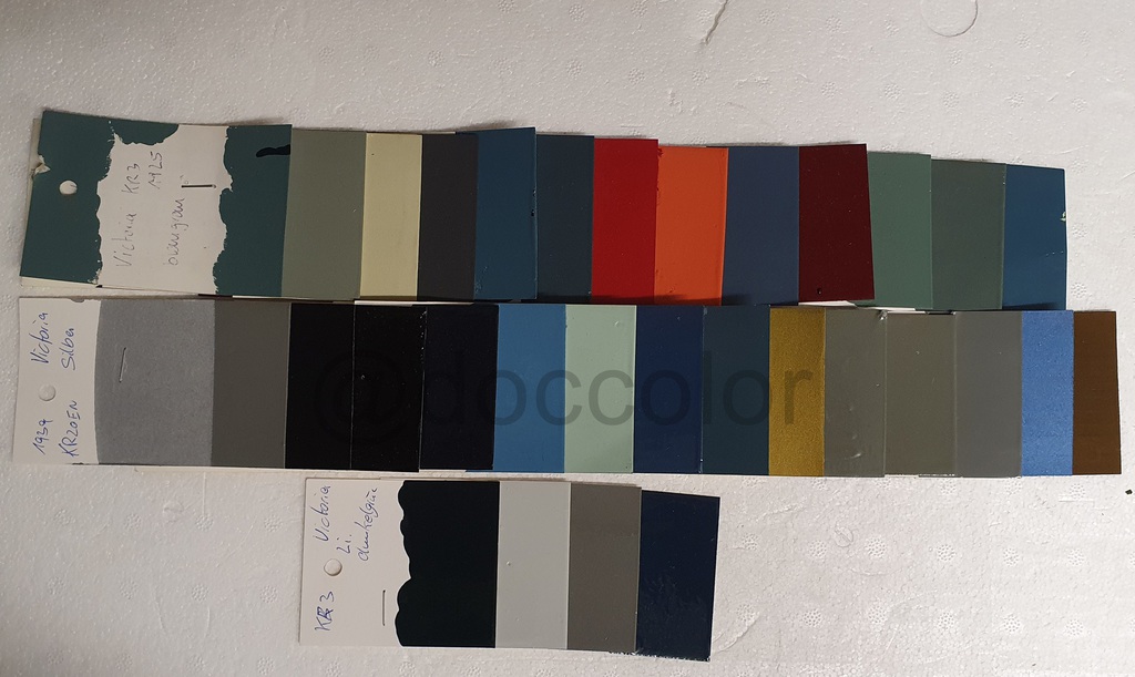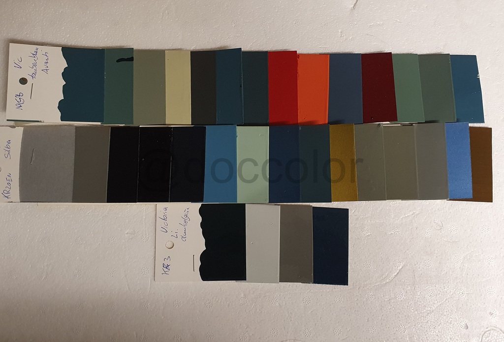 Taubenblau(Avanti), Blaugrau (KR3), Graugrün(350), Elfenbein(156), Antrazit(156), Taubenblau (VickyIII), Azurblau(V35), Avantirot, Korallrot, Lagoblau(Standard),Weinrot(KS125), Capri Variante,