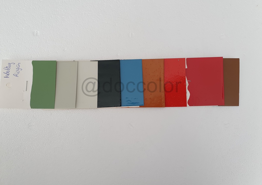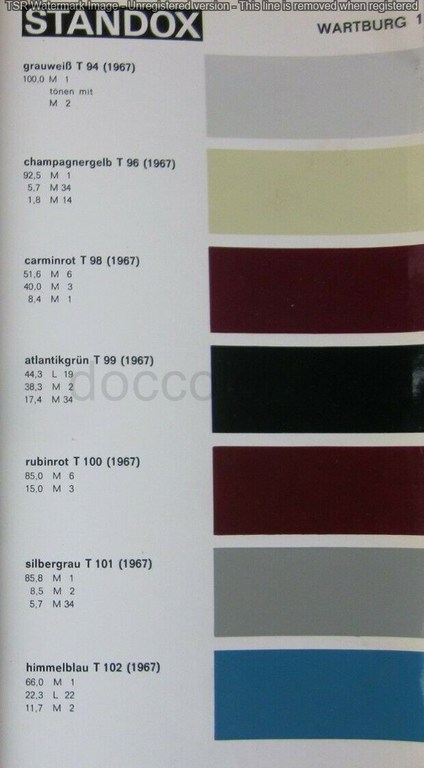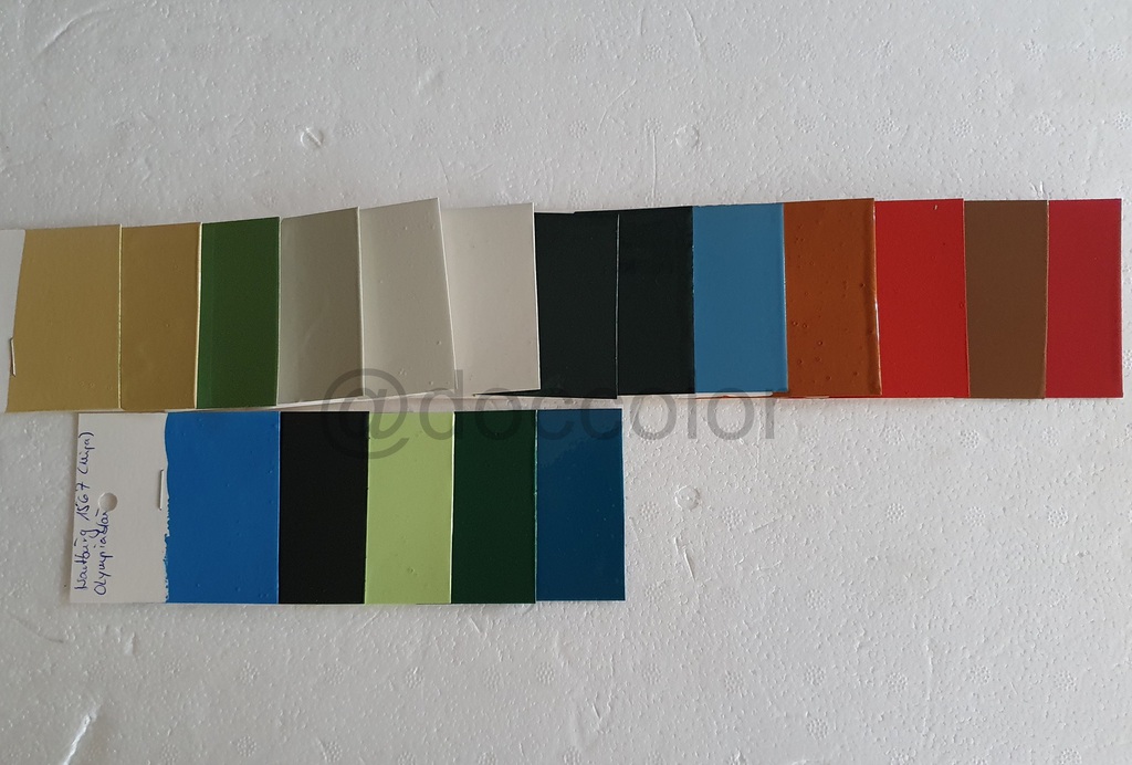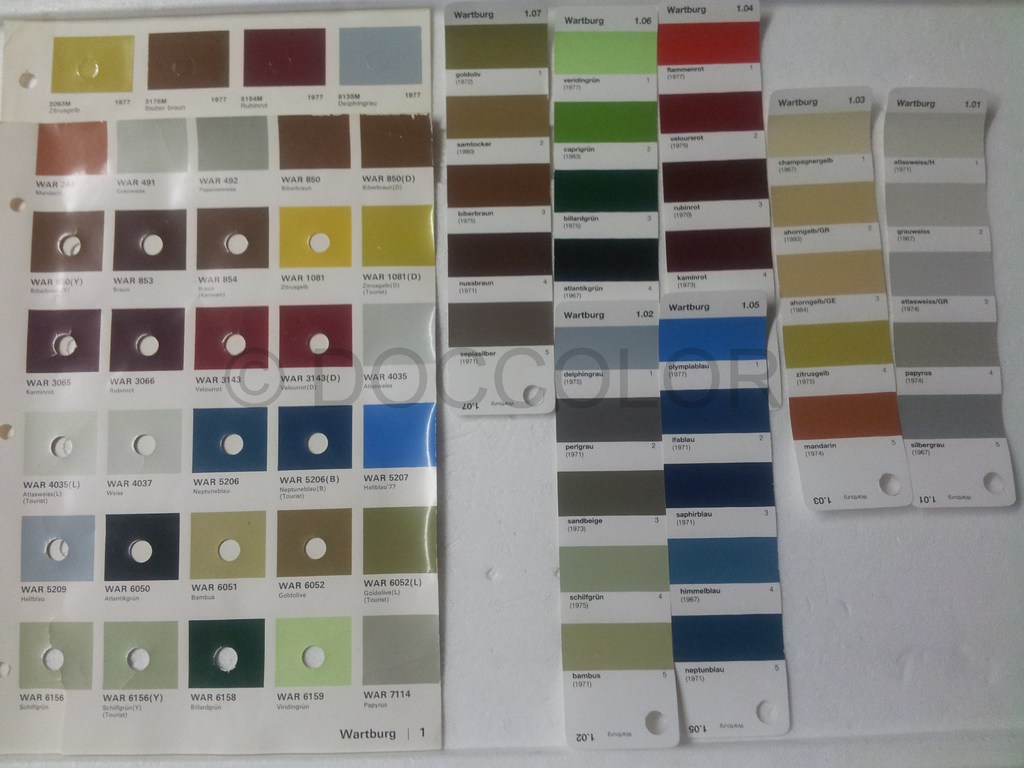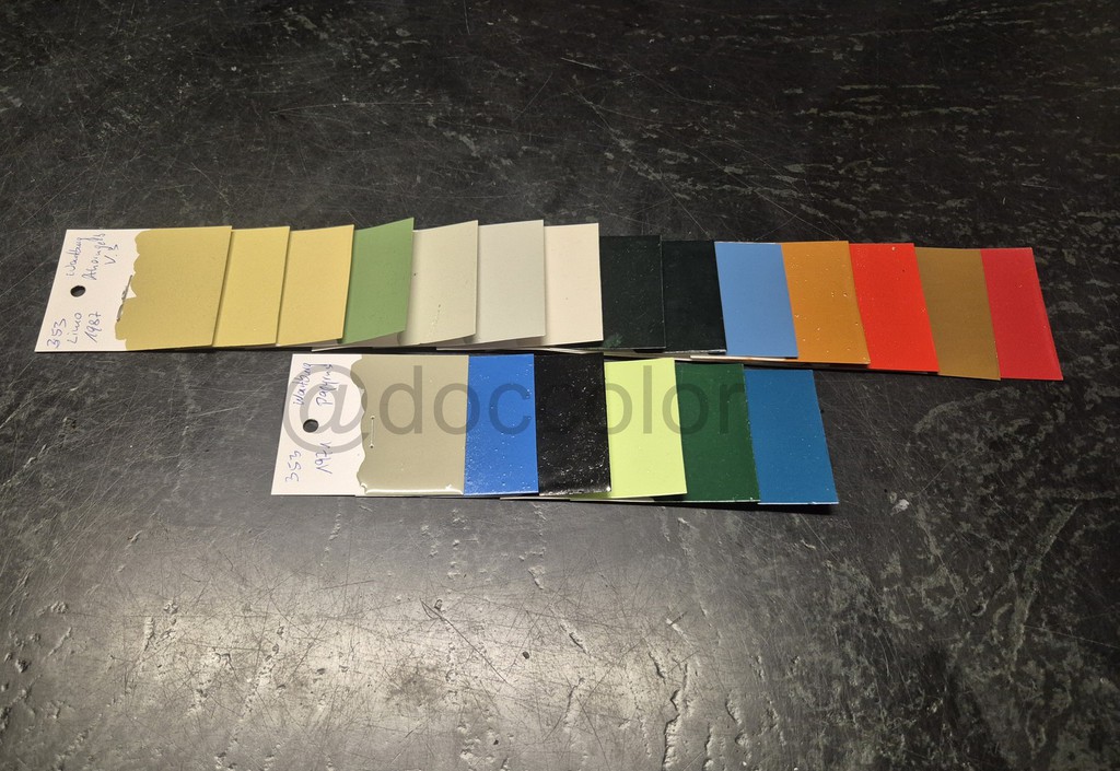 Ahorngelb V.3, Ahorngelb V.1, Ahorngelb V.2, Riogrün, Atlasweiss(86)V.2, Atlasweiss(Tourist)V.3, Atlasweiss(hell)V.1, Atlantikgrün V.2, Atlantikgrün V.1, Firnblau, Mandarin, Flammenrot, Biberbraun, Indianarot,