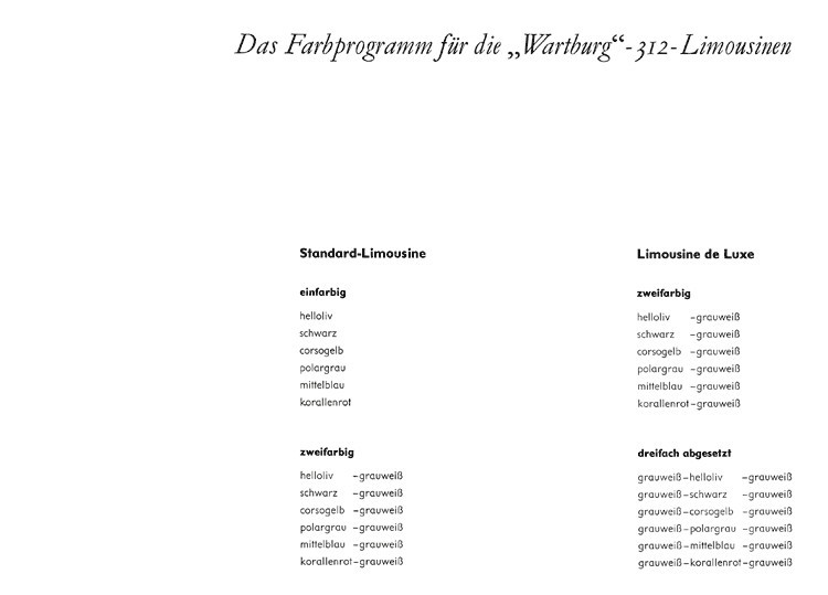 312/1 Luxus-Limousine 4-türig----- helloliv,schwarz,corsogelb,polargrau, mittelblau,korallenrot jeweils mit grauweiss oder 3fach mit